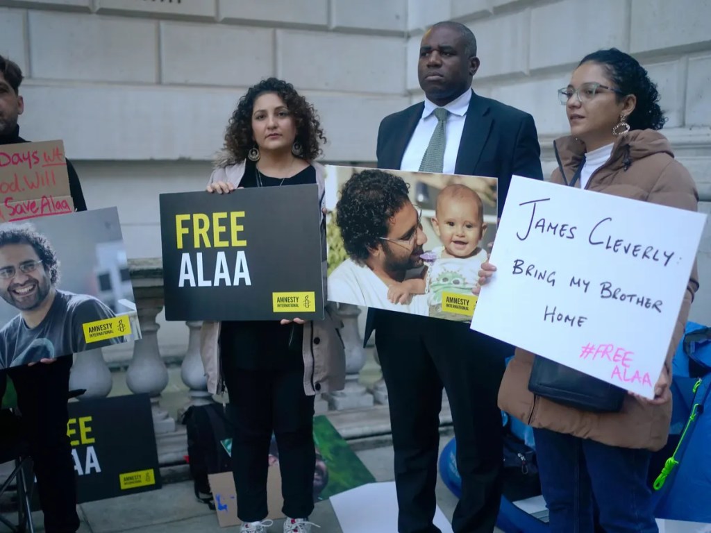 / iNews Mona Seif, sister of the jailed British-Egyptian human rights activist Alaa Abd el-Fattah, joined supporters outside Downing Street on Monday. (Photo: Wiktor Szymanowicz/Anadolu Agency via Getty)